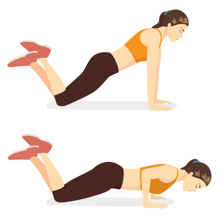 Push ups work the chest and shoulders as well as core muscles. Like squats they can be done almost anywhere and require minimal equipment. Never fear! There are many variations of push ups and there is an alternative for almost everyone: floor, knees, counter, wall, and more. In every variation of push up make sure that: