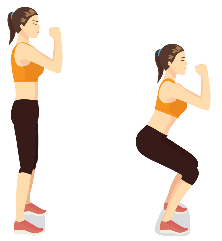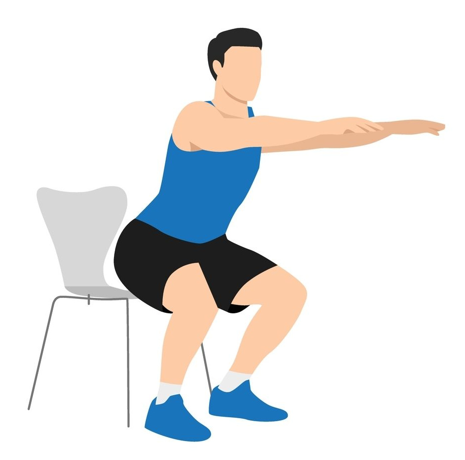 - It can help to have a chair behind you as a reminder but also as a gauge to make sure you are squatting to the same depth each time. Tap the chair each time you squat. If the chair height is too low, try the edge of a sofa or put a pillow on the chair seat to raise the height.