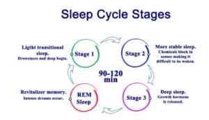 Sleep is divided into different stages, each with its own distinct characteristics and functions. Each 4 stage “sleep cycle” is about 90 minutes in length. If we don’t consistently pass through all of these 90 minute sleep cycles FOUR TO SIX every 24 hours we are at risk for a range of detrimental health effects.