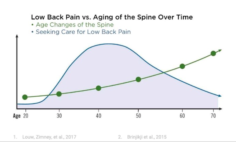 This graph offers an interesting perspective and is worth a closer look. The green line shows that age-related changes in the spine increase over time, while the blue line indicates that people seek the most medical care for back pain in their 40s and 50s.